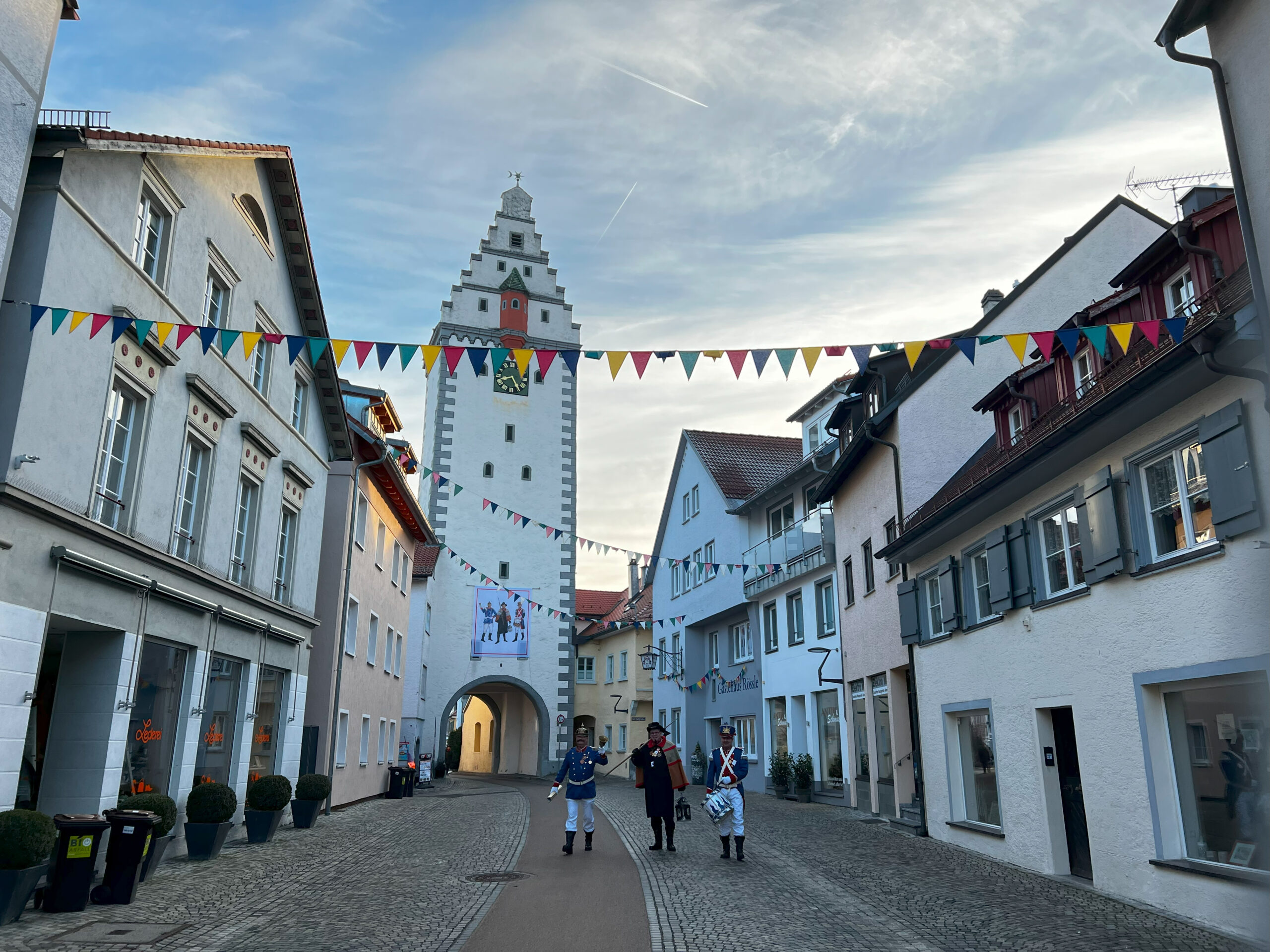 Schlag 8 Uhr marschiert die Nachtwächtergruppe unter schrillem Geschelle und lautem Trommeln durchs Wurzacher Tor stadteinwärts und leitet somit die heiße Phase so richtig ein